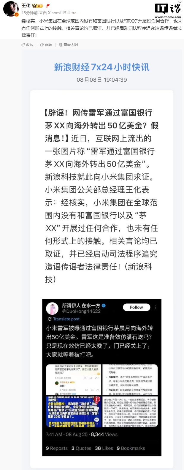 王化:小米集团没有和富国银行以及“茅 XX”开展过任何合作