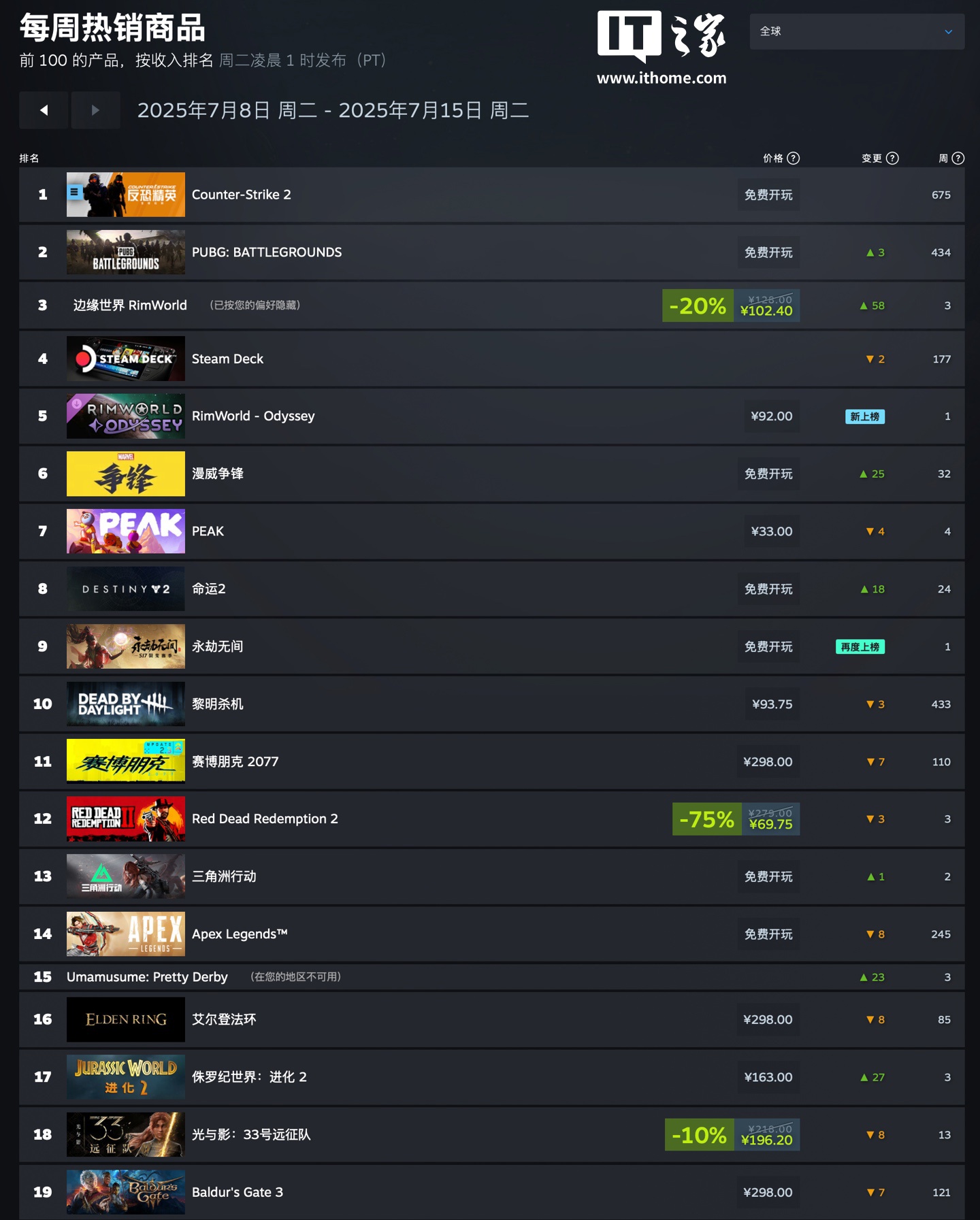 Steam 新一周游戏销量榜出炉:《边缘世界》携 DLC 登顶全球榜