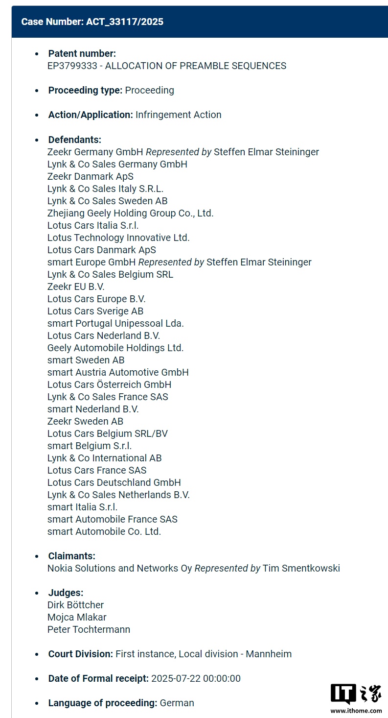 诺基亚起诉吉利、极氪、领克等专利侵权